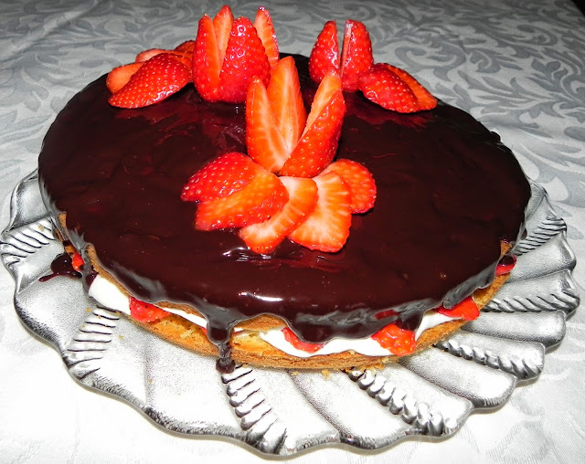 Junte os ingredientes da cobertura e leve ao lume em banho maria, mexendo sempre até o chocolate estar derretido. Cubra o bolo com o creme e decore a gosto com os morangos